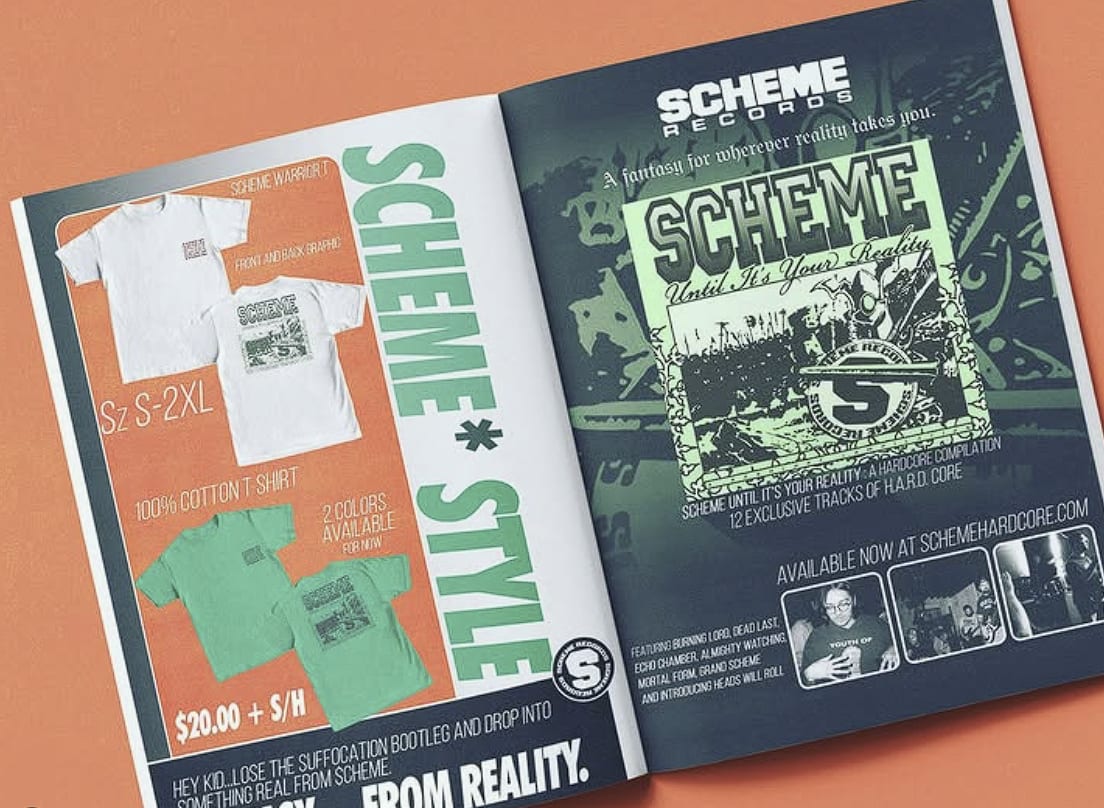 I don’t want to get too far ahead of myself, but it feels like your background in graphic design has carried over into SCHEME in a really noticeable way. Everything you put out, whether it’s shirts, records, or even postcards, has a clear direction and feels very intentional. And for anyone who might not realize it, having an in-house graphic designer for your band or label honestly has to be one of the biggest cheat codes in hardcore. Do you feel like working in graphic design has shaped how you approach running the label or any other aspect of your life?